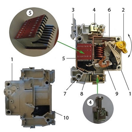 Также в устройстве имеется специальная металлическая пластина 10, которая предохраняет корпус автомата от прогорания.